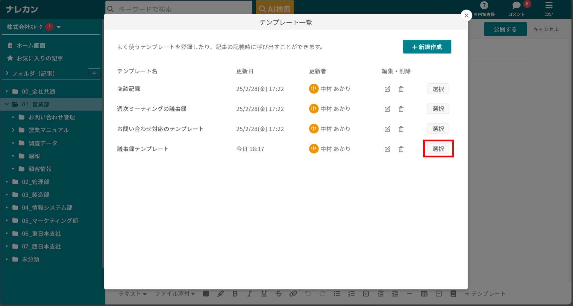 ②「+新規作成」をクリックし、新しいテンプレートを登録できます。