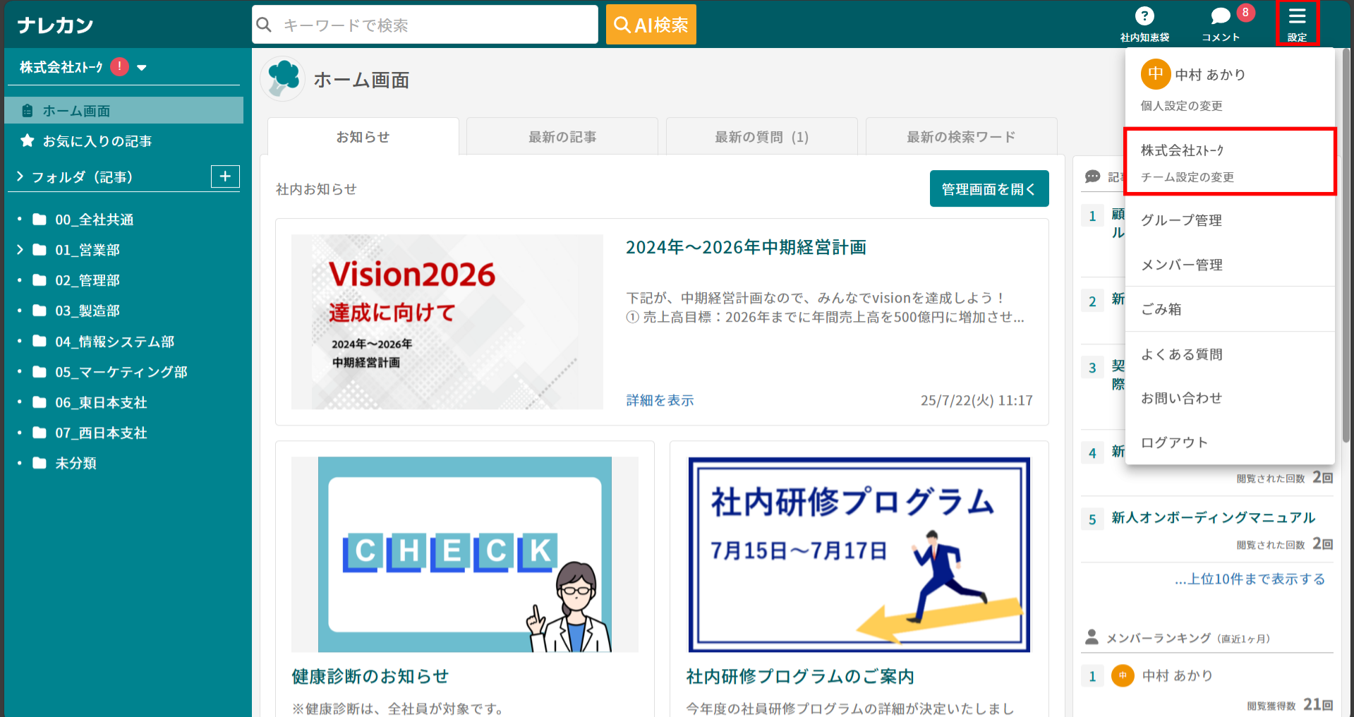 ③「設定」>「チーム設定の変更」>「テンプレート管理」からも、テンプレートの登録・編集・削除が可能です。
