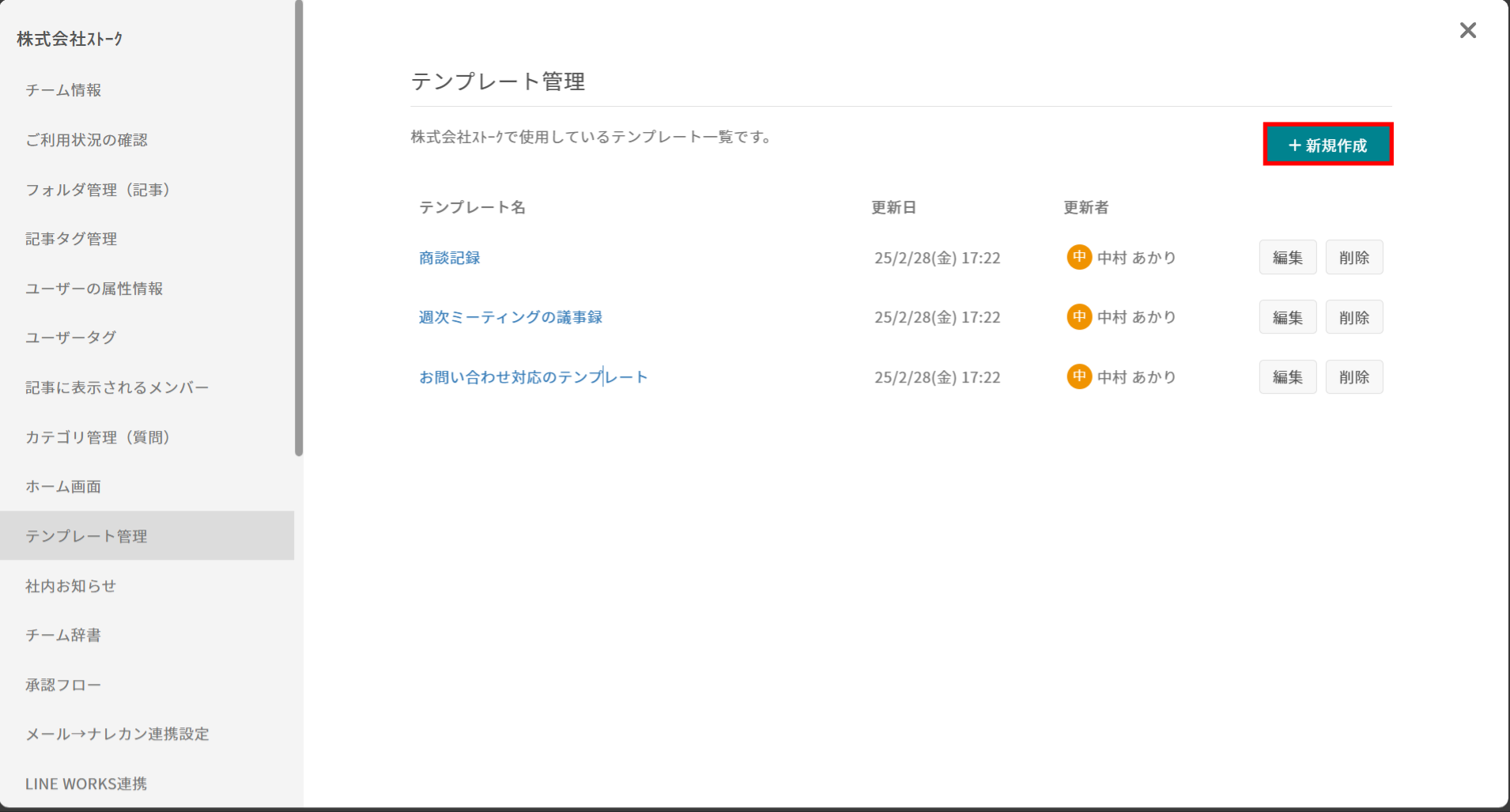 ・テンプレートの作成・編集・削除は、「一般メンバー権限」以上のユーザーが可能です。