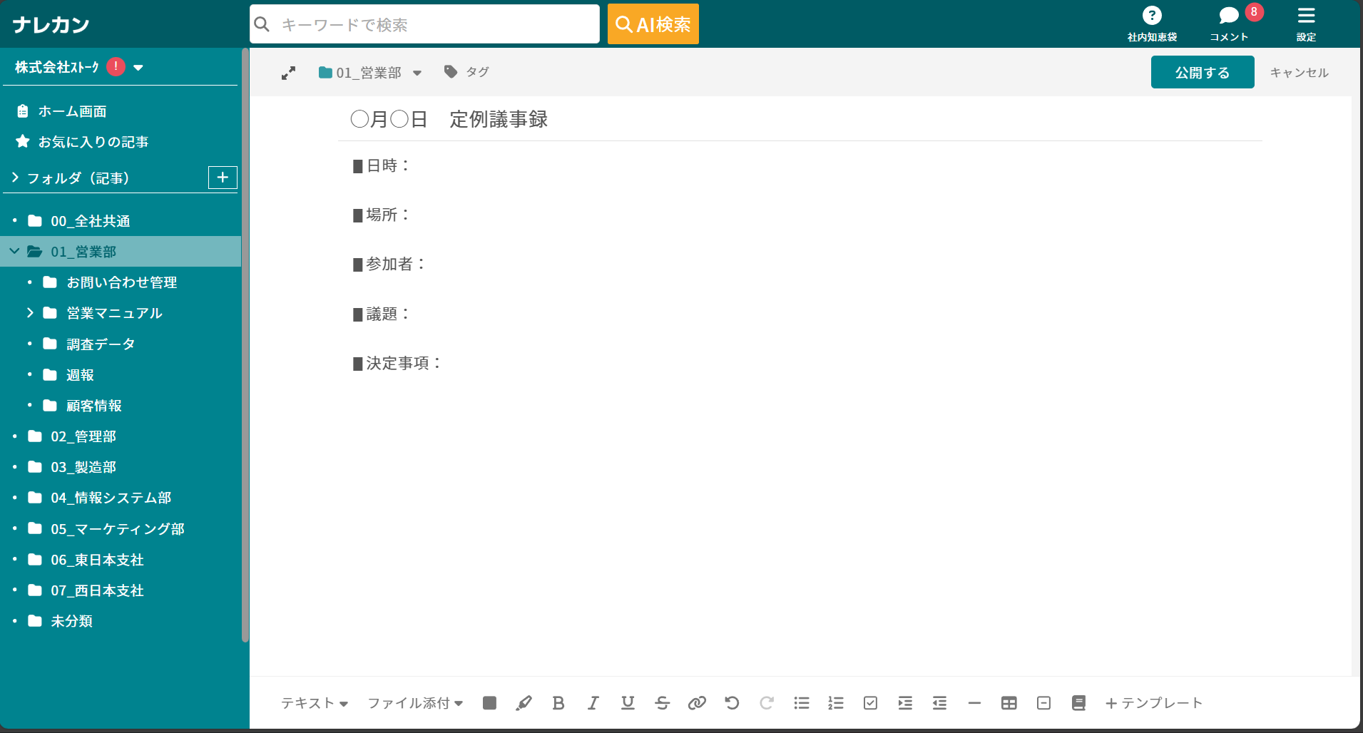 ④例えば、下記のように議事録のテンプレートを登録できます。