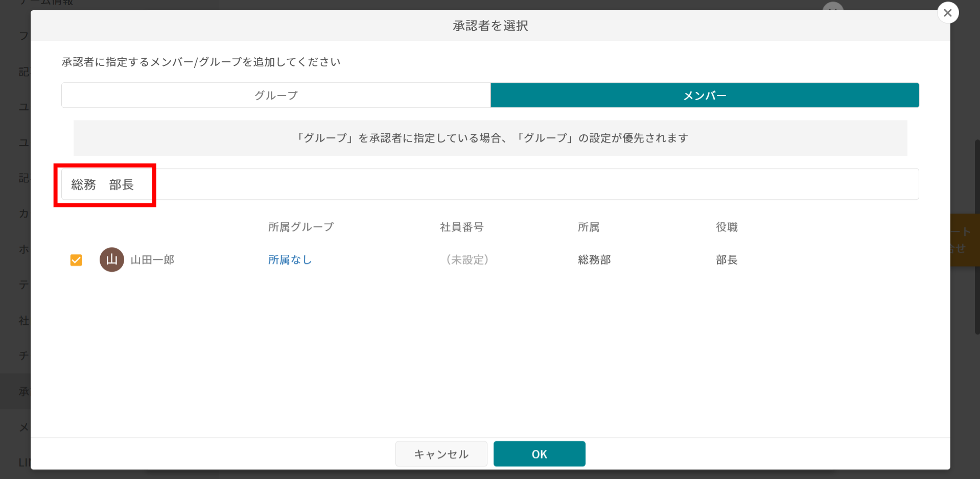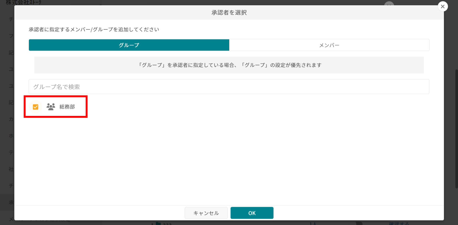 ④「グループ」もしくは「メンバー」から、承認者を設定しましょう。