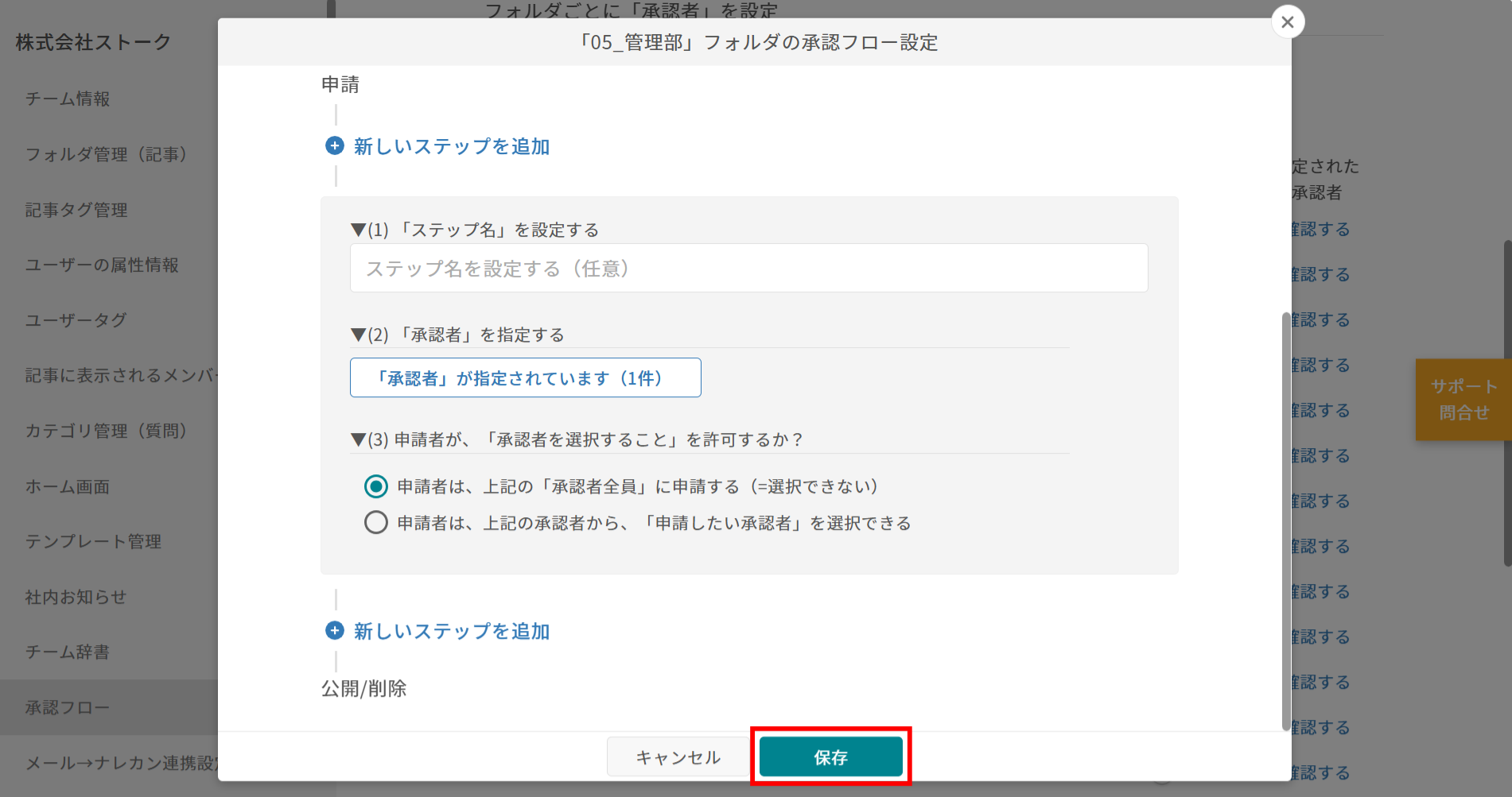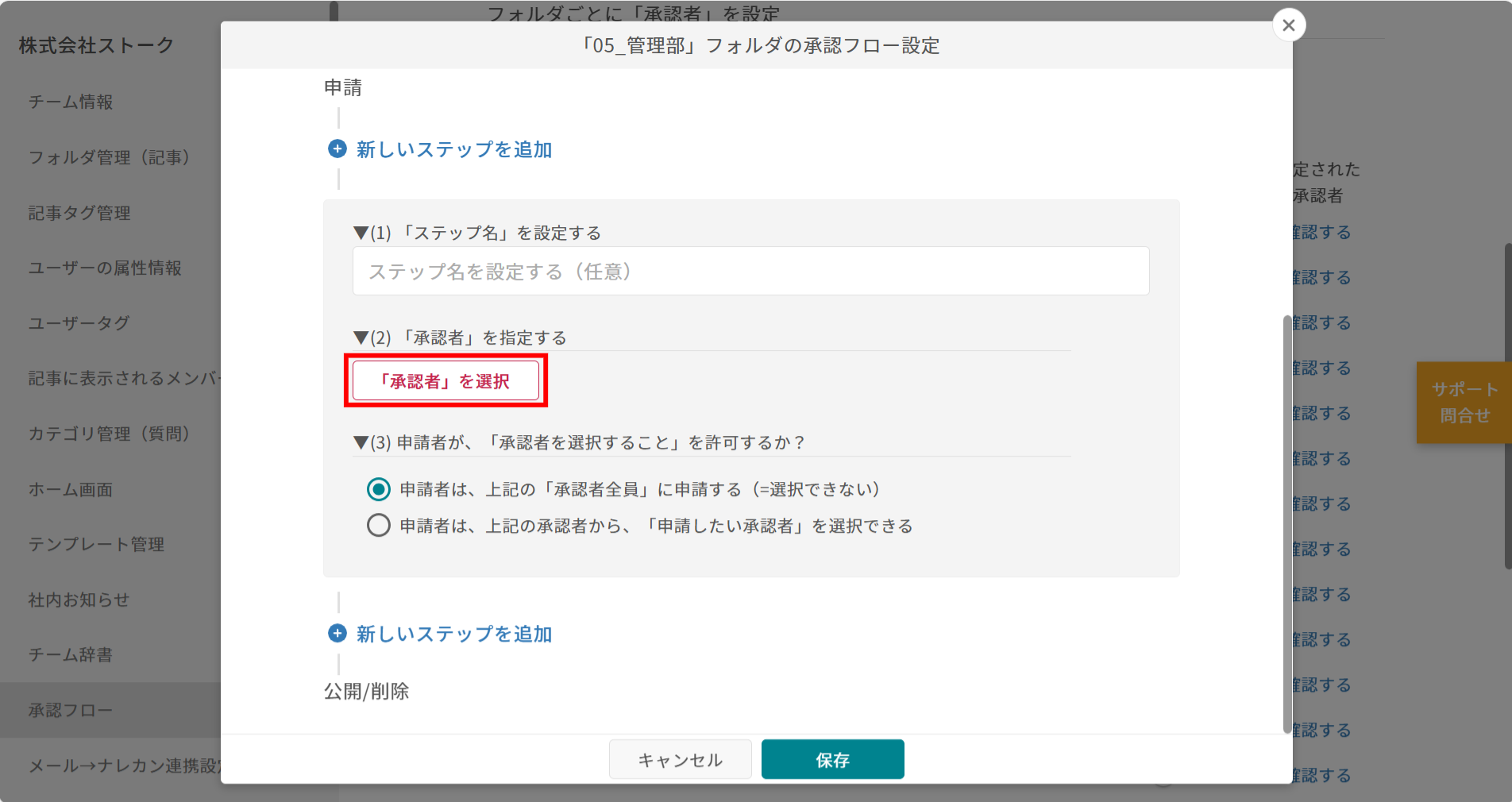 (※「新しいステップ」を追加することで、多段階の承認フローを設定することも可能です。)